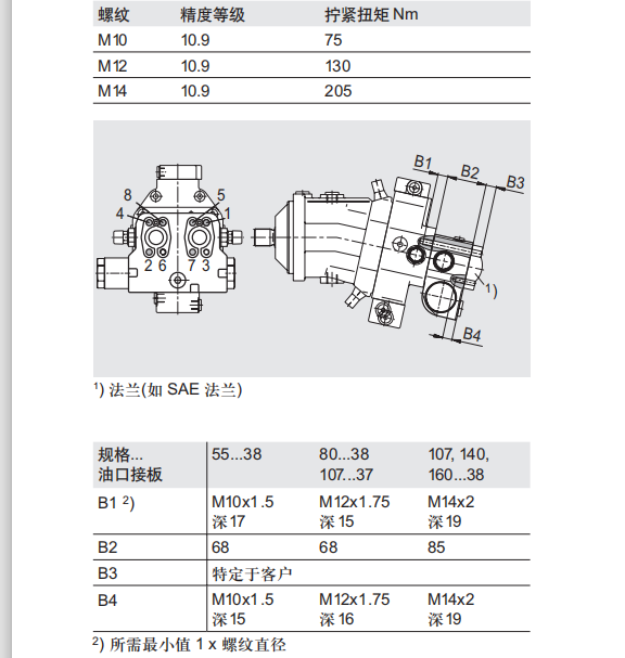 交货时,平衡阀由两个定位螺钉固定在马达上。与工作管路相连时,不要拆下定位螺钉。如平衡阀和马达分开交付,必须先使用提供的定位螺钉将平衡阀固定在马达的油口接板上。以上两种情况最后都是使用工作管路的螺纹油口(如SAE 4 孔法兰)将平衡阀固定在马达上。共需要6颗螺纹长度为B1+B2+B3的螺钉以及两颗螺纹长度为B3+B4的螺钉。固定螺栓时,必须按1到8的顺序(如图所示)分两个阶段进行。在第一阶段螺钉应拧紧到50%的拧紧扭矩,然后第二阶段拧紧到最大扭矩(见下表)。
