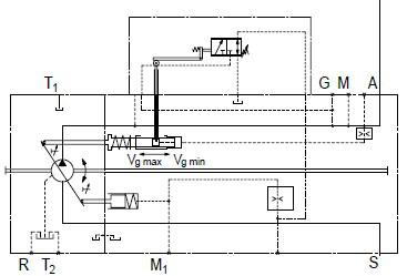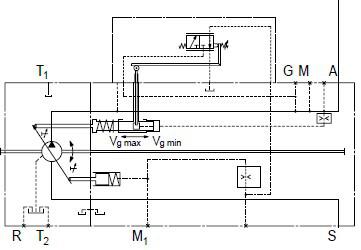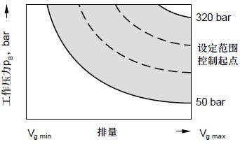 如果工作压力超过设定的弹簧力,控制阀将被摇臂起动,使泵回摆(Vgmin方向).摇臂上的手柄缩短,从而使工作压力以排量减小的相同比率增加,而不超过驱动功率(PB.Vg=常数)